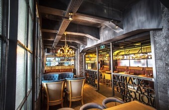 «Грот Бар» вдохновился бытом жителей северной Европы и создал уютное пространство с преобладанием дерева и черного металла. Просторное помещение ресторана в 600 кв. метров разделено на несколько зон: кухню, бар, завод по производству пенного и три зала для отдыха гостей. Характер интерьеру придают винтажные весла, люстры из рогов и другие интересные детали.